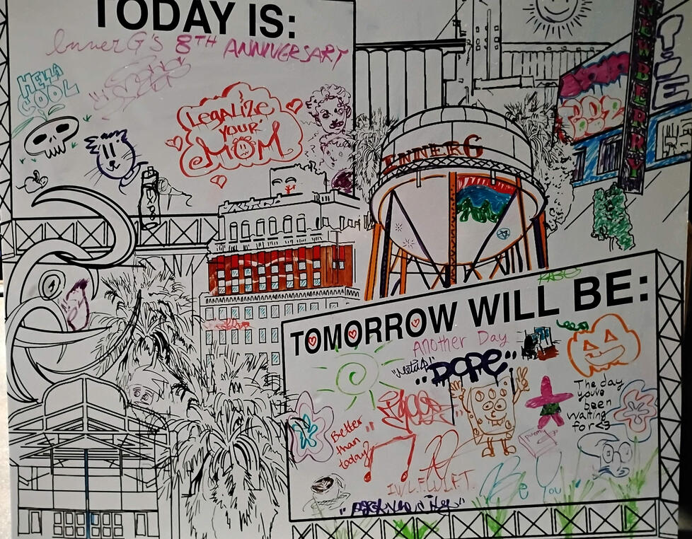 JOANN has experience with large-format interactive art pieces as well as intimate group settings. Her most recent community involvement was with the Stockton-based art collective InnerG at the HATCH. Her whiteboard piece “BILLBOARDS” was drawn on by dozens of participants at InnerG’s anniversary event on Oct. 3, 2025, celebrating 8 years of self-expression and holding space for all creatives.
